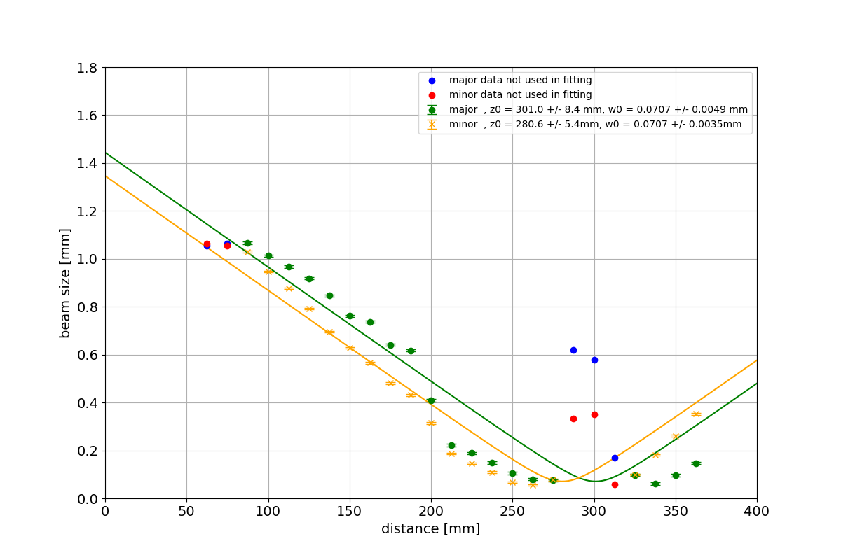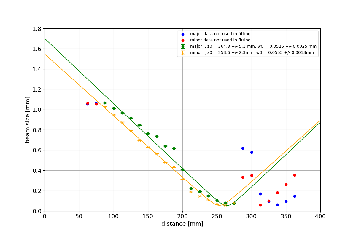 Major : waist position = 264.3 ± 5.1 mm, waist size = 0.0526 ± 0.0025 mm