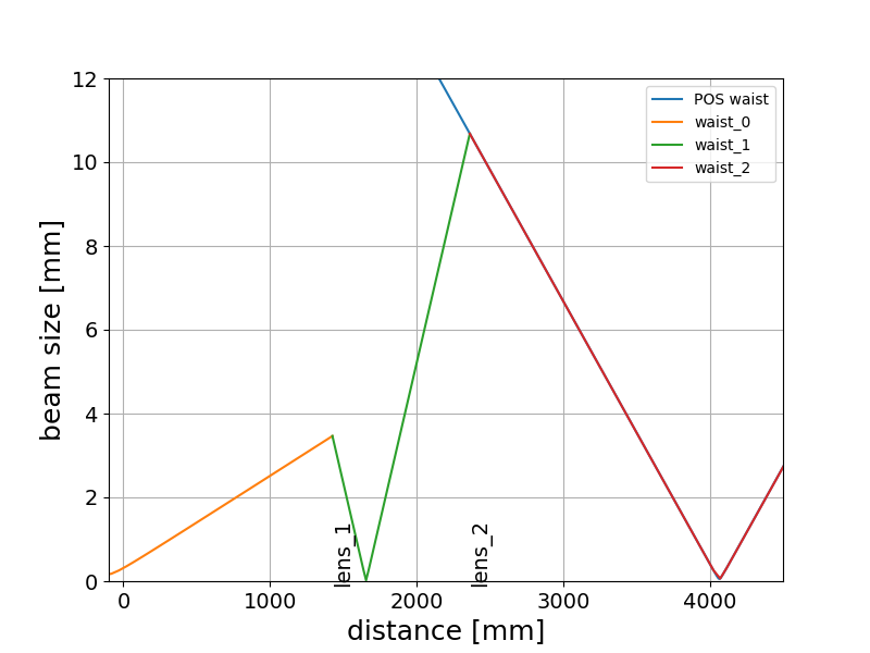 Next, based on these waist positions and waist sizes, we determined the positions of two lenses for mode matching (Fig.4). The origin is defined as the point where the laser is emitted. The orange line represents the beam profile of the laser, the green line represents the beam profile after passing through the first lens, the red line represents the beam profile after passing through the second lens, and the blue line represents the target beam profile of the infrared laser on the POS optical table.