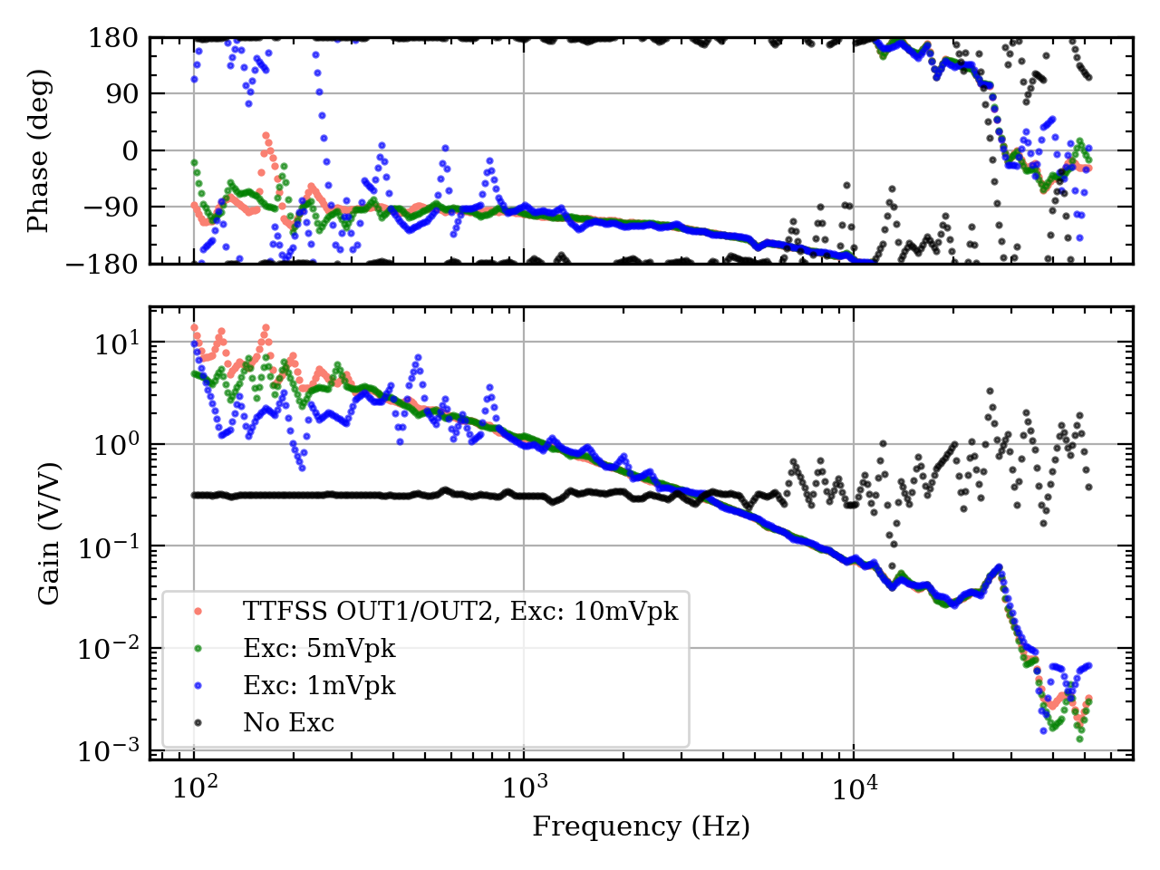 - Fig. 4 is for the measured bode diagram of the open-loop TF of the PMC lock loop with varing the excitation input to the TTFSS, but as already mentioned, please be careful about the 10dB additional gain block, which is apparent in Fig. 3 and the black lines in Fig. 4.