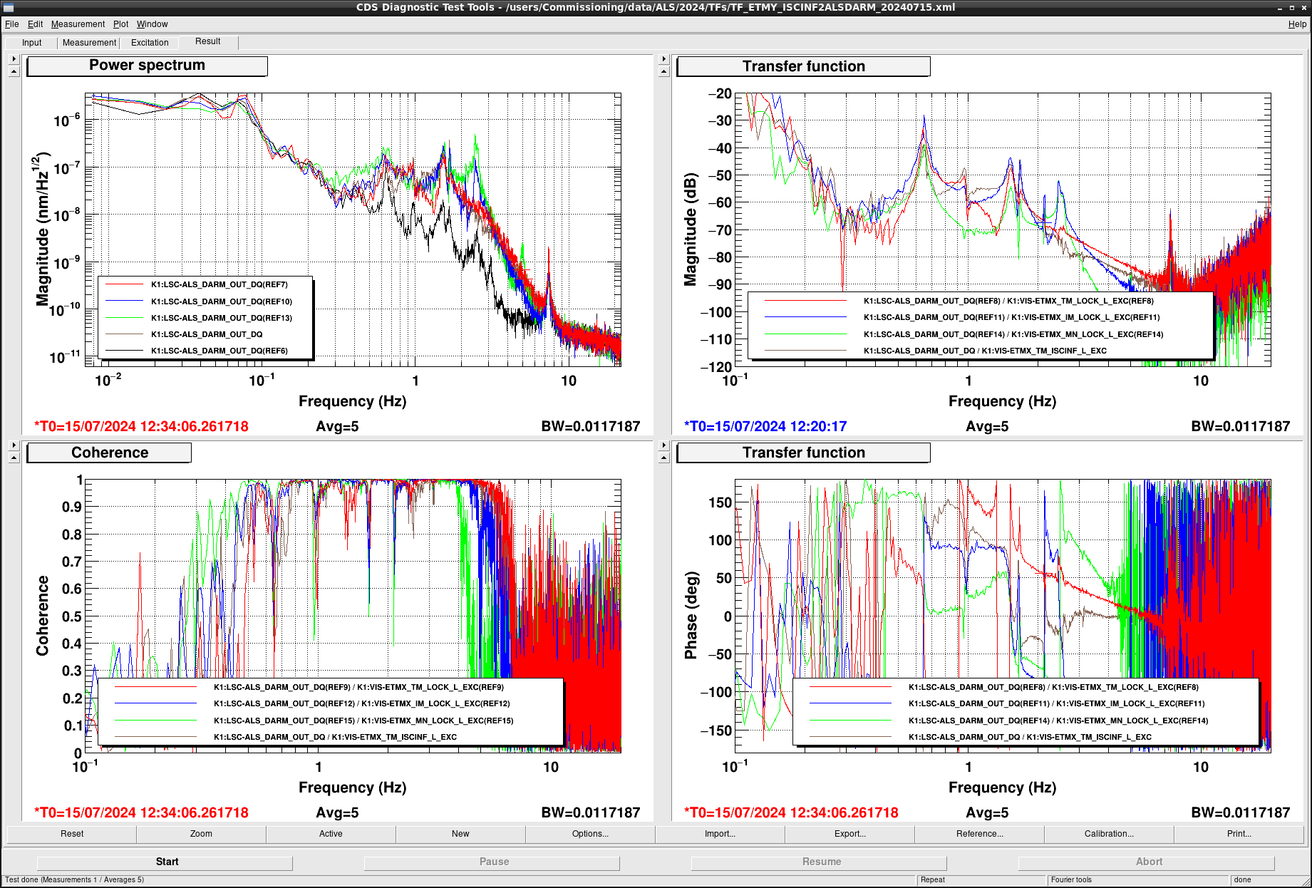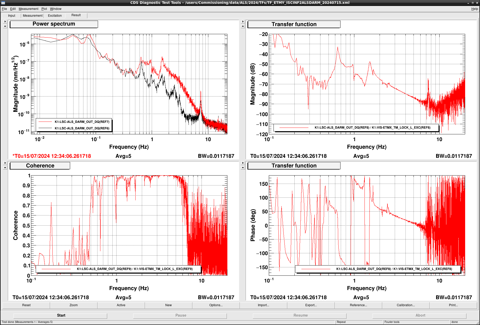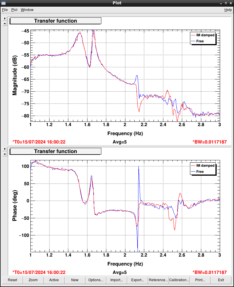To damp the resonant peak, we temporarily implemented a damping loop with the photosensor signal if ETMX IM L. We designed a damping filter and added it in K1:VIS-ETMX_IM_DAMP_L as shown if Figure7 and Figure8. Figure9 shows the spectra of K1:VIS-ETMX_IM_DAMP_L_IN1 with various conditions. The blue curve is the spectrum without control, and the red (green) curve show the spectra when the control was closed with gain -30 (-3). Without any actuation, the photosensor barely see the peak at 2.14 Hz with S/N ~ 2. In thhe case with gain of -30, we can see an excess noise at 2.5 Hz, which is another resonant mode. This is due to a finite gain of the damping filter at 2.5 Hz. We tried to make the bandwidth of the filter narrrow, but finally gave up. Instead, we decreased the gain to -3 so that the filter does not excite the 2.5 Hz oscillation.