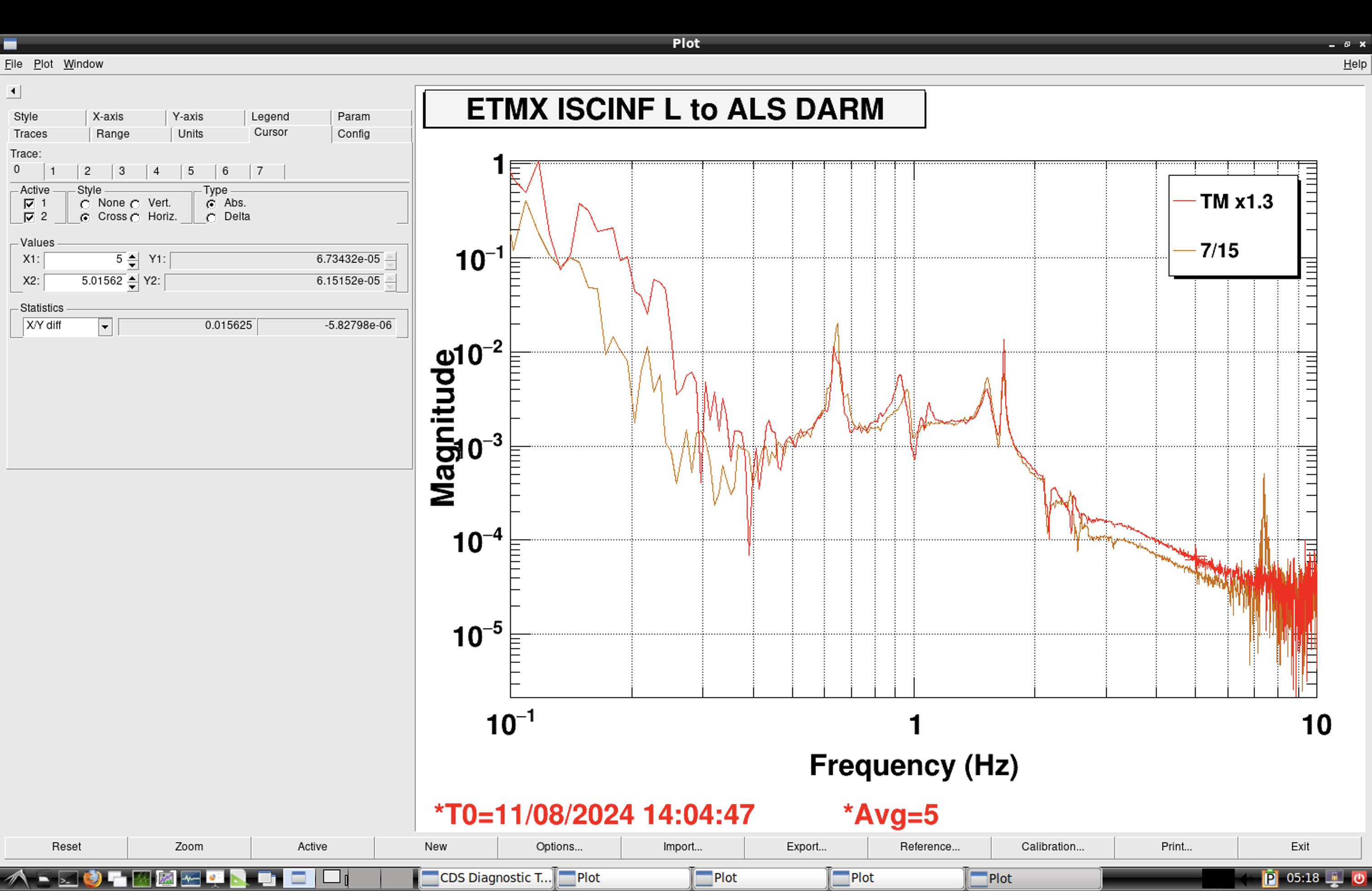 As reported here, ETMX actuuators were unstable at some crossover frequencies and due to this we could not lock ALS DARM. To reduce the instability, I tried changing the relative gain of the actuators. Figure1 shows the transfer function from ETMX_ISCINF_L to DARM_OUT with various gain of ETMX TM actuator. From these results I chose the gain of 1.3. To match the gain of the total actuator, I compared the value around 5 Hz and estimated the factor as 0.677 (Figure2), and this factor was implemented in "gain" filter of each stage (Figure3, FIgure4, Figure5).