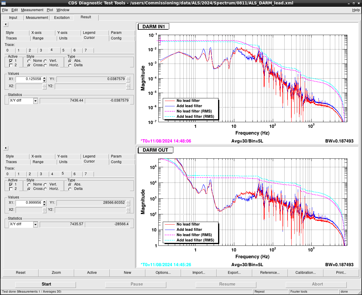 After that, I engaged ALS DARM and successfully locked without no oscillation. I measured the open loop transfer function of ALS DARM and the result was almost the same as the previous measurement (Figure6). I also measured OLTF with a lead filter impleneted by Ushiba-san, and thanks to this filter the phase margin was improved. However, RMS of the feedback filter got larger (~ x1.2) as shown in Figure7, so I didn't turned on the filter after all.