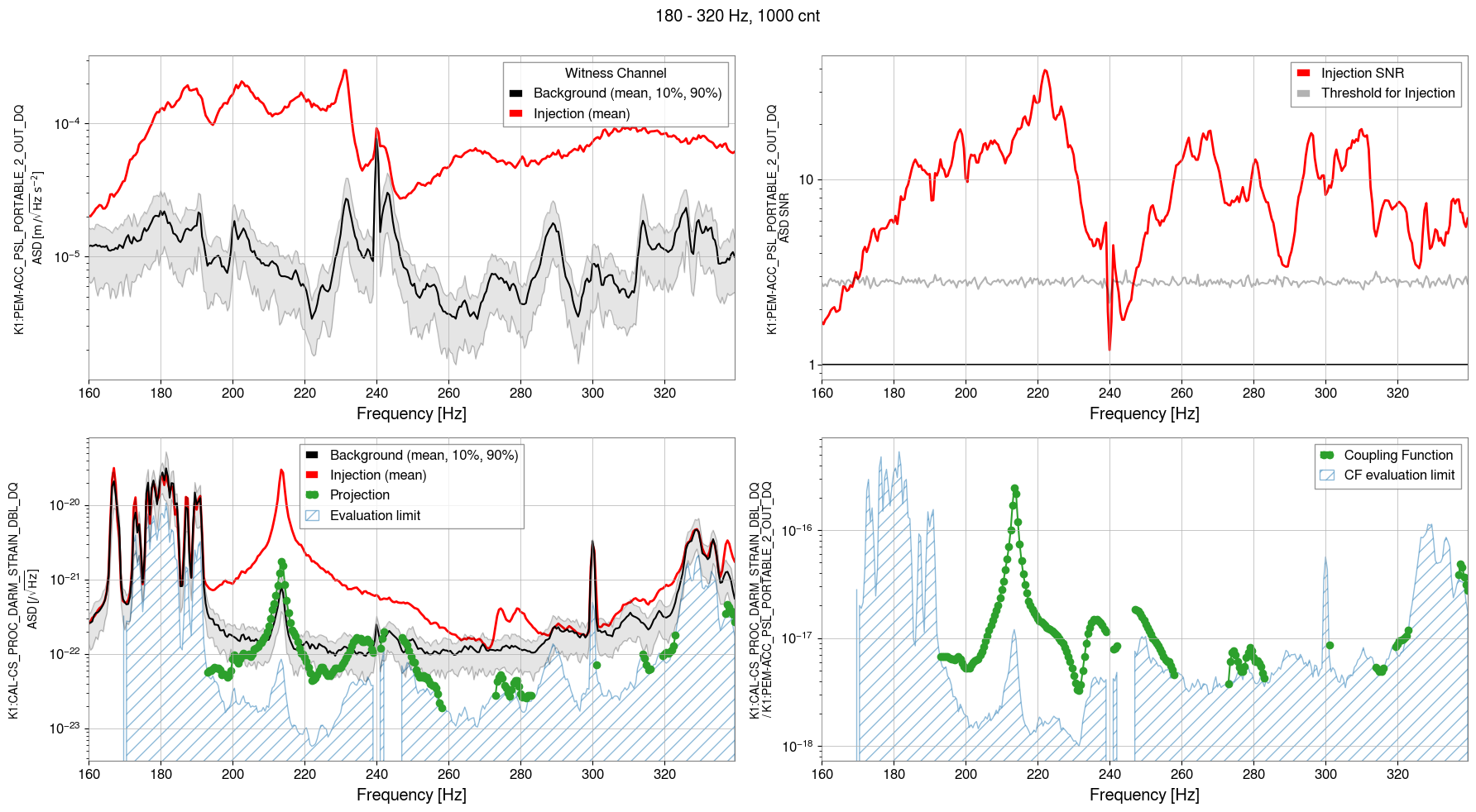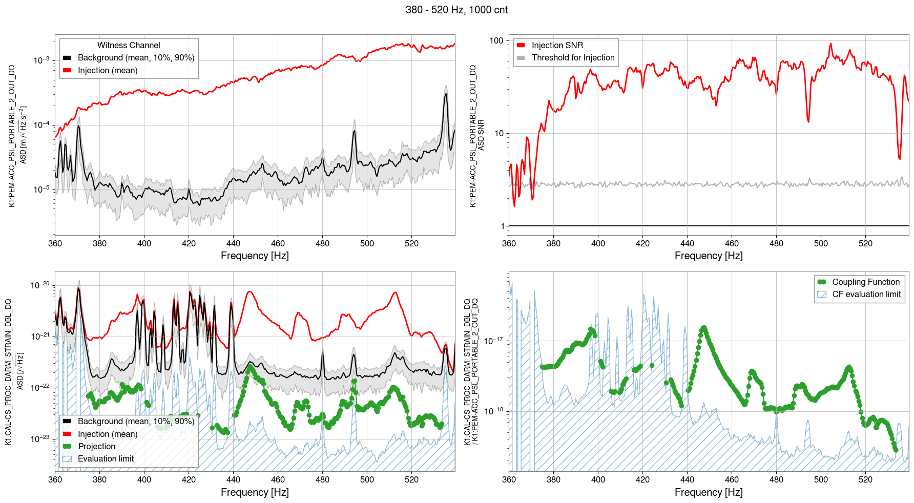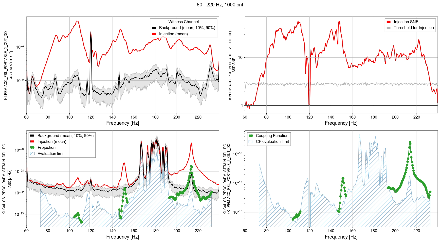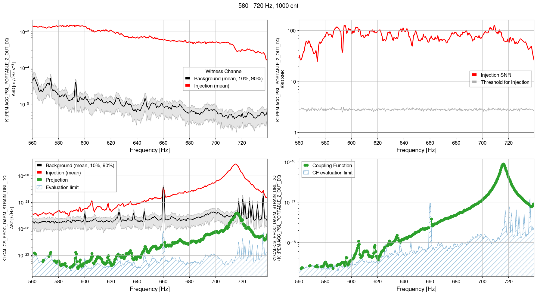Plots for the Shaker 4 injection:EXC channel : K1:PEM-EXCITATION_MCF0_RACK_12_EXCREF : K1:PEM-ACC_PSL_PORTABLE_2_OUT_DQ