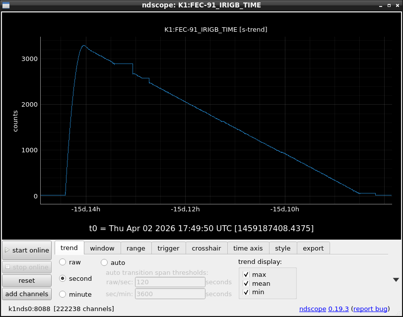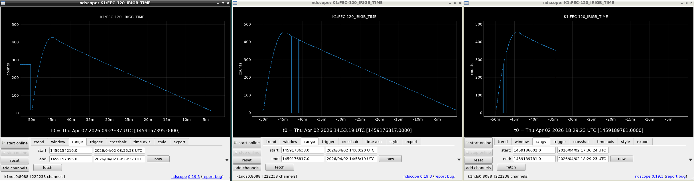 Only remaining concern is that it takes a few hours for synchronizing IRIG-B when a cold boot of the front-end computer is performed. In the past, similar things often occurred when down time became so long and a room temperature changed largely maybe because it took long time to be stable in the temperature of a crystal oscillator of timing slave. On the other hand, in this time, it takes long time even when a down time is only a few seconds. Such a thing wasn't reproduced in the test bench. So we have no idea to solve this issue now.