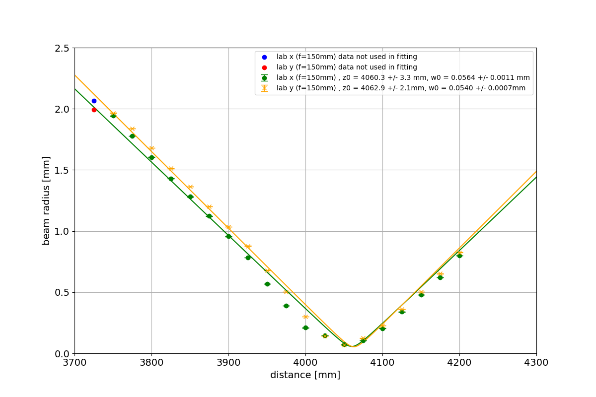 We fitted the beam profile measured after the first lens in klog:36752 (Fig. 1). The points represent the measured data, and the line represents the fitting result. The green and orange points were used for the fitting, while the blue and red points were not used. The origin corresponds to the position where the laser is emitted. Since the recommended measurement range of the beam profiler is a beam diameter of 45 μm to 4 mm, data points with a beam radius exceeding 2 mm were excluded from the fitting. The calculated values from klog:36739 and the fitting results are as follows: