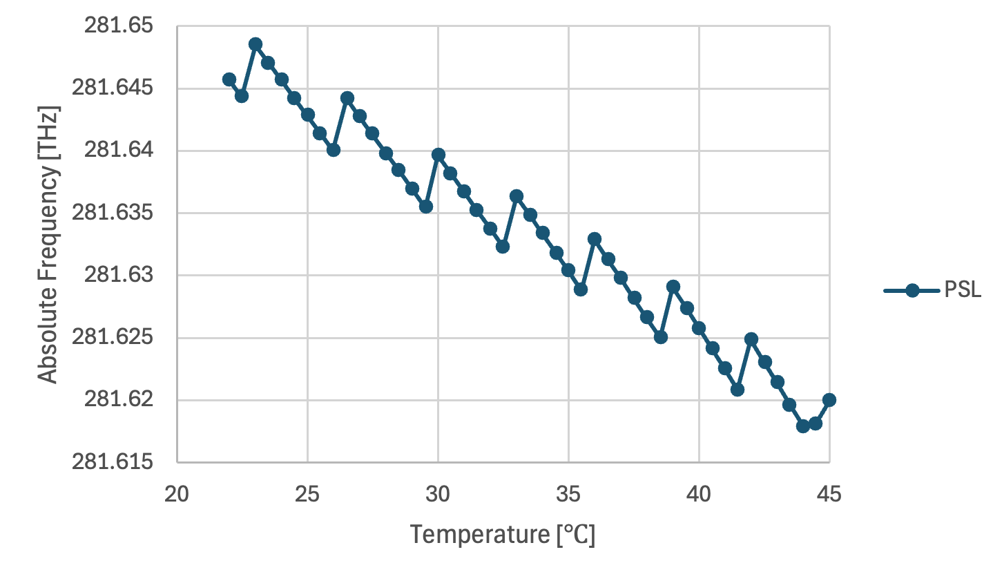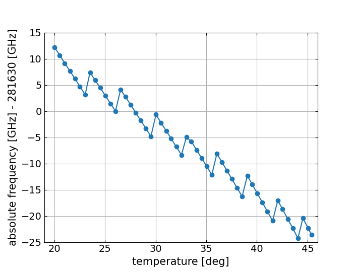 The absolute frequency of the sub-laser was measured while changing the temperature in steps of 0.5 ℃ (Fig. 3). The origin of the vertical axis is 281630 GHz.