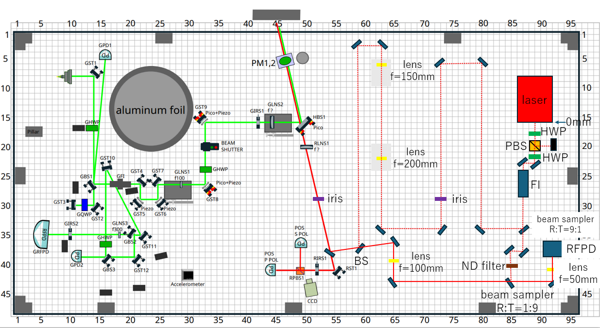 To align the optical path of the sub-laser beam with the IR beam on the POS table, we reinstalled two irises and performed alignment. In addition, we prepared mirrors, a BS, lenses, and ND filters to combine the sub-laser beam and the IR beam on the POS table and inject them simultaneously into the RFPD.