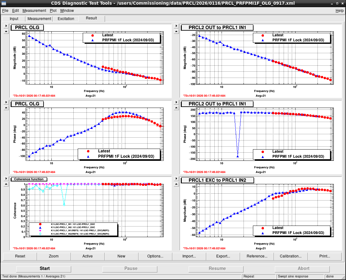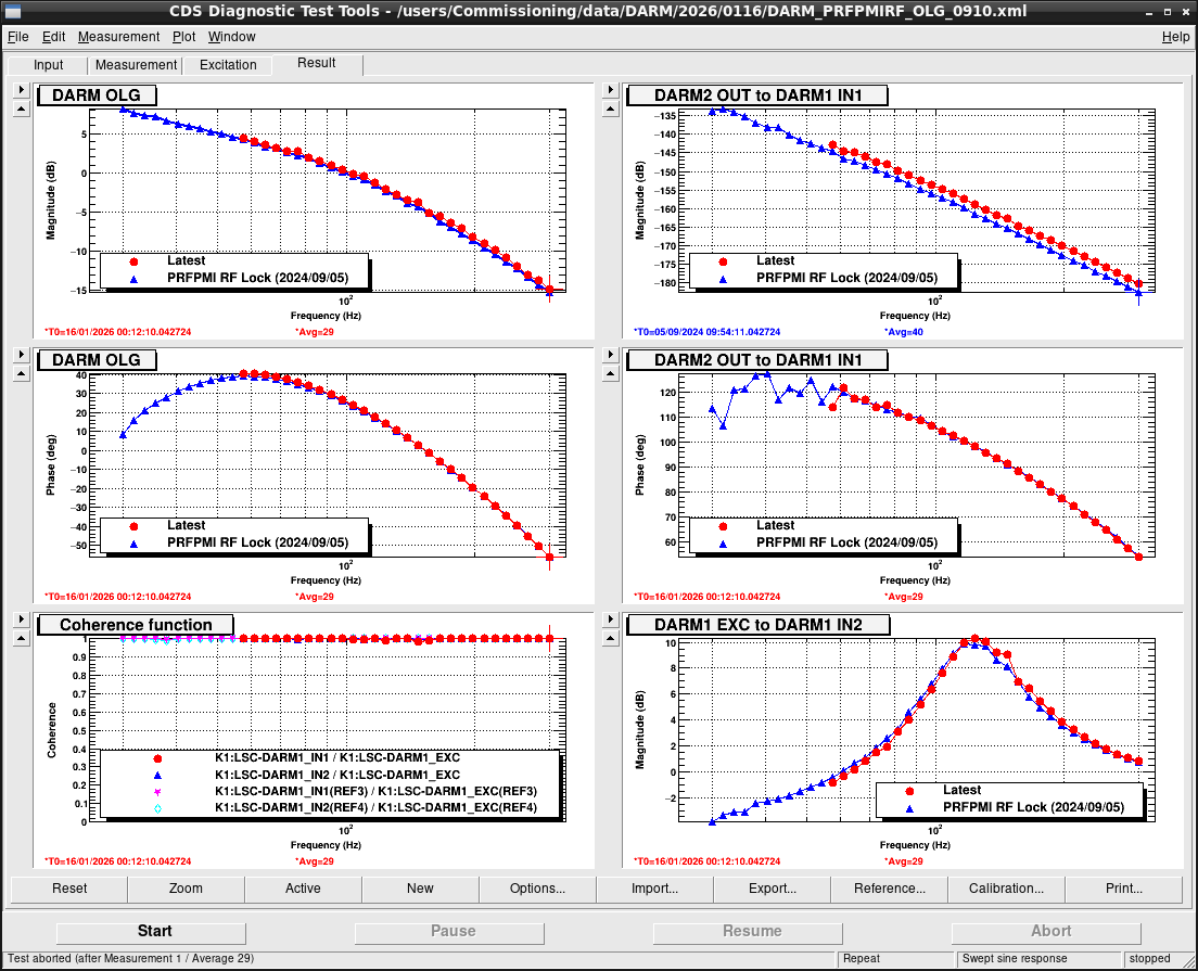 Print this reportMeasurement of the TM,IM and MN 2 ALSDARM TF To lock the ALS DARM, I measured the transfer function from TM, IM and MN L to ALS DARM. Fig.1. showed the TM to ALS DARM. Compared from July 2024, the gain increased about 0.758 (-259.51718 - (-258.75964) at 5 Hz), so I changed the FM4 of the K1:VIS-ETMX_TM_LOCK_L filter bank gain(1.255)gain(0.80352) -> gain(1.255)gain(0.80352)gain(-0.75754) -> gain(1.3229952) Fig.2. and Fig.3. showed the IM and MN, respectively, we didn't change the gain for IM and MN (but coherence above the 5 Hz in MN became worse)